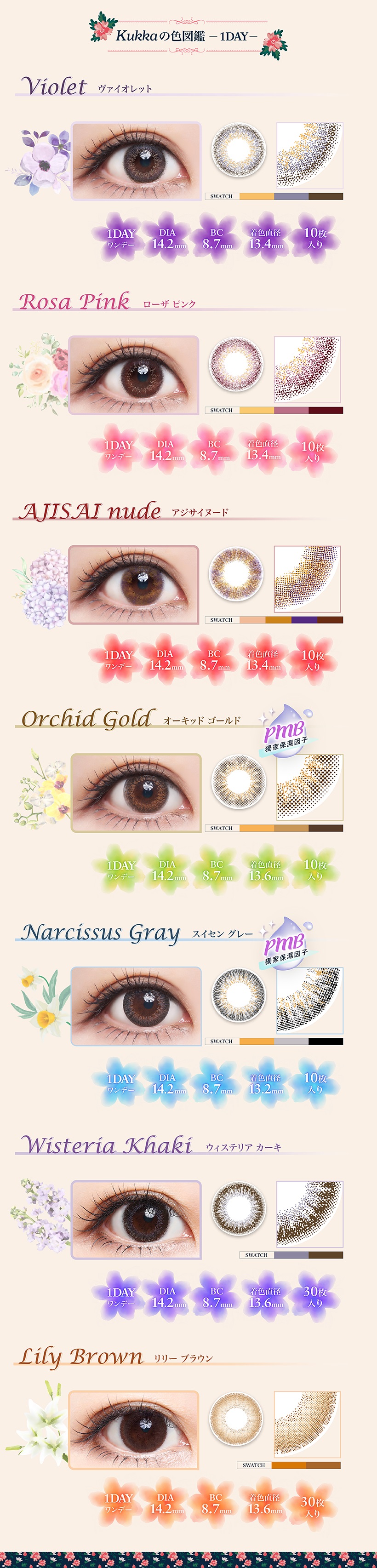 品牌 :Kukka;弧度 :8.7 mm;直徑 :14.2 mm (著色直徑 : 13.4 mm);功能 : 彩妝;度數範圍 :近視度數:平光 (沒有度數); 近視100度 (-1.00) 至 近視600度 (-6.00)(每25度一級),近視650度 (-6.50) 至 近視800度 (-8.00)(每50度一級);顏色選擇: Orchid Gold,Naricissus Gray,Wisteria Khaki,Lily Brown,Rose Pink,Violet,Ajisai Nude;含水量 : 38% (低含水量);物料 : 水凝膠;配戴模式 : 每日即棄;包裝規格 : 10片/盒;產地 : 台灣;保質期 : 2年
