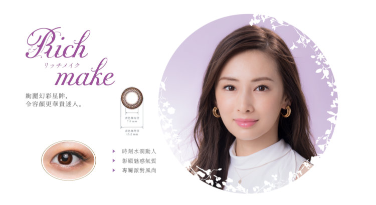 品牌 :SEED;生產商 :SEED;弧度 :8.7 mm;直徑 :14.0 mm (著色內直徑 : 13.2 mm);功能 : 彩妝;度數範圍 :近視度數:平光 (沒有度數); 近視100度 (-1.00) 至 近視600度 (-6.00)(每25度一級),近視650度 (-6.50) 至 近視900度 (-9.00)(每50度一級);顏色選擇: Base make (Light Brown 淺啡),Natural make (Black 黑),Rich make (Brown 啡),Grace make (Grey 灰);含水量 : 38% (低含水量);物料 : 2-HEMA, EGDMA (水凝膠);配戴模式 : 每日即棄;包裝規格 : 30片/盒;產地 : 台灣;保質期 : 2年